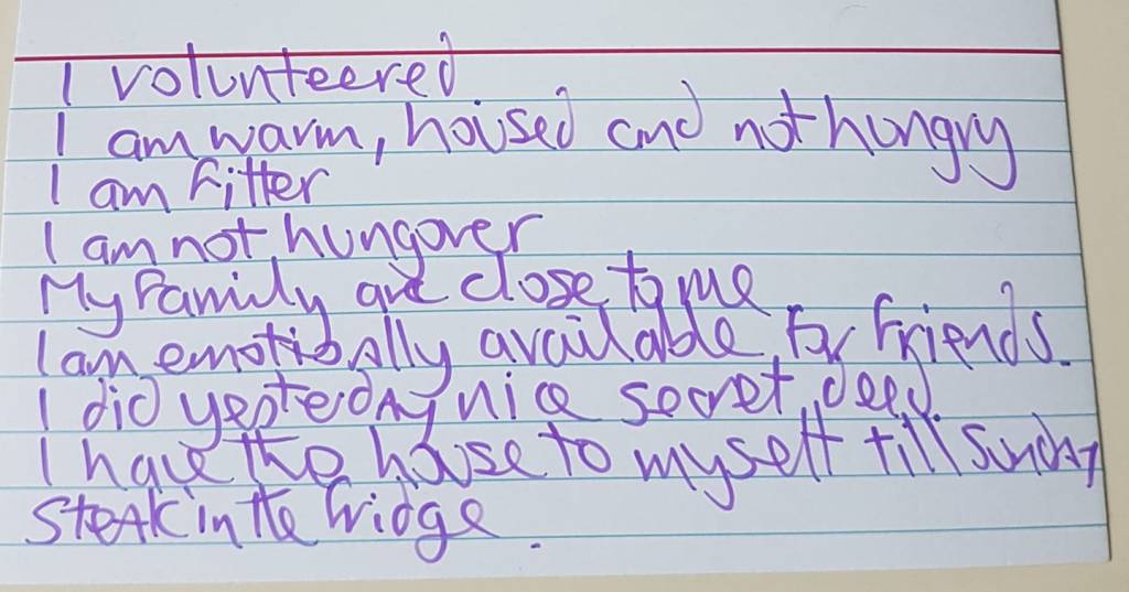 The picture is todays gratitude list. It’s bigger than normal, but hopefully gives you an idea of how it works.