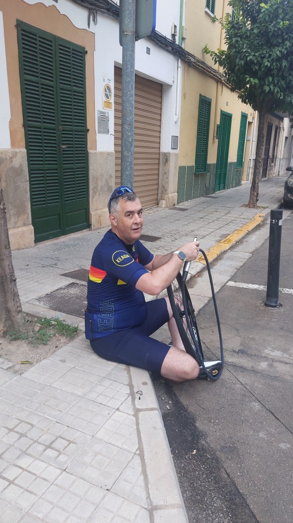 No cycling adventure is complete without a bit of drama, right? On the way back from Sa Calobra, Martin one of the few potholes and so we stopped in the village of Inca with a puncture. Normally, a quick fix—but it turns out tyre levers don’t always cooperate, especially when you’re tired, hungry, and trying to make your way back to base. A good learning opportunity, and one that left me wishing I had an electric pump – not to self, buy one.