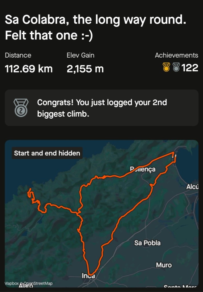 Pro tip: Keep a steady pace getting there, no heroics, you’ll need energy for the return, and it’s a long way home from Sa Colabra, it was 6hours in total in the saddle, 9hours door to door…. And don’t eat a meal at the bottom, just grab a coke and get back to the top!